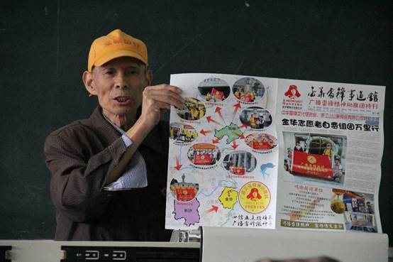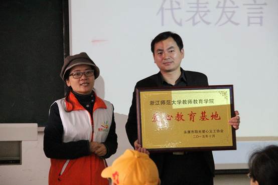 仪式还邀请了金华市雷锋文化馆创办人曹荣安先生上台讲话,曹老先生对本次活动的举办表示了赞许,讲述了许多人生哲理,为我们带来了一次难忘的精神洗礼。最后,徐美儿会长上台讲话,向教育学院赠送了“爱心教育基地”的名牌,祝福阳光公益行动永远继续下去,为孩子们带去更多的爱与陪伴。
