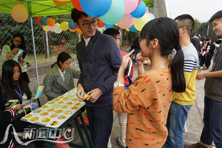 (校新闻中心学生记者团 林乾浩 实习记者 谭正廷 姚晓菲)走出寝室,体验活动乐趣。11月14日,杏园篮排球场人头攒动、热闹非凡,校第三届心理游园会现场组织的27个游戏项目人气爆棚。