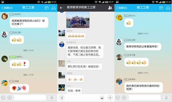 在今年的教职工体育运动中,教师教育学院整体成绩突出,先后有40余人次教师参与到运动当中,取得了突破性的成绩,其中包括浙师大第三届教职工体适能比赛团体第八名,第41届田径运动会教职工10×60米迎面接力赛第三名和2015年全校教职工篮球赛第六名等奖项。在各项比赛的同时,学院教师的微信群和教工之家QQ群同时直播比赛,纷纷为同僚们鼓励加油,希望全院教师都能在运动的过程中收获快乐,凝心聚力建设好教育学院的教工之家。