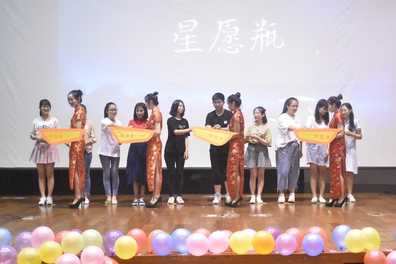 宣誓结束,各班新生代表上台讲述自己的梦想,用言语描绘出一张张绚烂多彩的大学生活图景,并将装载梦想便签的星愿瓶放入月亮船。船只终将驶向远方,意气风发的少年也将怀揣初心,砥砺前行。