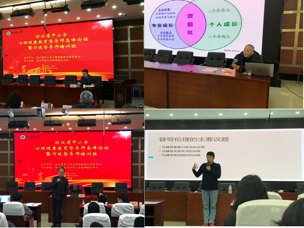 2019年1月10日,浙江省中小学心理健康教育督导师高峰论坛暨行政督导师培训班在浙江师范大学教师教育学院17幢112会议室顺利举行。浙江师范大学副校长李伟健教授、浙江省教育科学研究院院长朱永祥教授、南京晓庄学院陶勑恒教授、浙江师范大学钟思嘉教授、浙江省教育科学研究院副书记吴贤平、浙江师范大学研究生院常务副院长孙炳海教授、浙江省心理健康指导中心办公室主任庞红卫博士、浙江师范大学教师教育学院副院长曹晓华教授等出席了此次论坛。