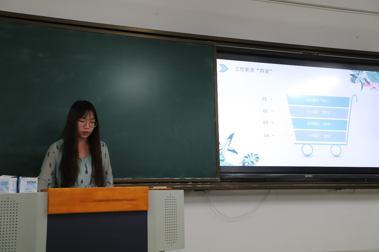 大会尾声,院学生会心理部部长方哲总结陈词,他对各位心理委员的认真付出表示真挚感谢,指出心理工作需要学校、部门和心委的共同努力,同时也鼓励同学们在心委工作中锻炼自我,广泛学习。