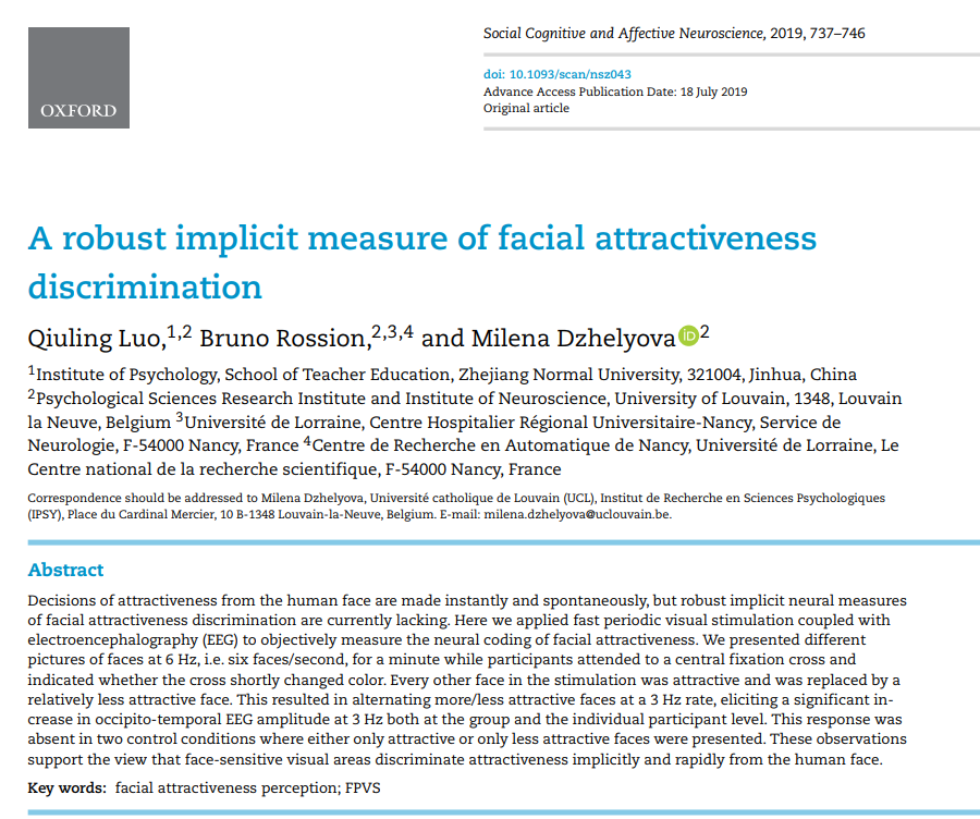 Luo, Q., Rossion, R., Dzhelyova, M. (2019). A robust implicit measure of facial attractiveness discrimination. Social Cognitive and Affective Neuroscience.