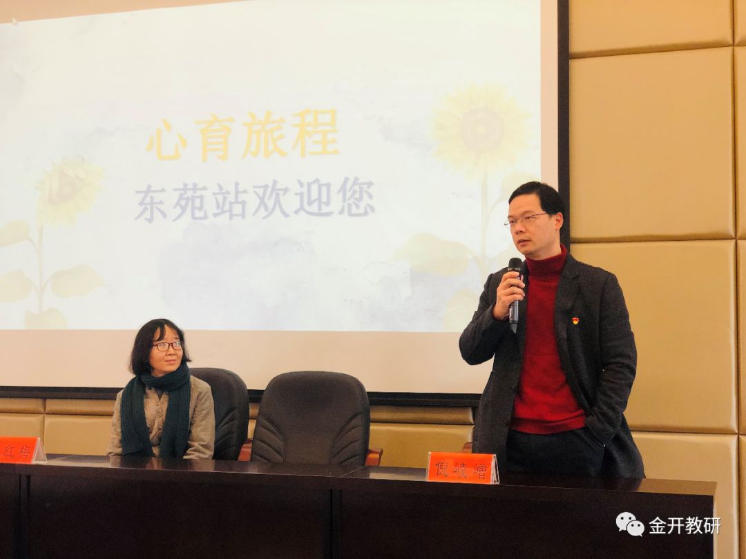 金华市东苑小学校长倪崚嶒为读书会致辞,浙师大心理系李红梅老师为与会人员做心理辅导工作指导。