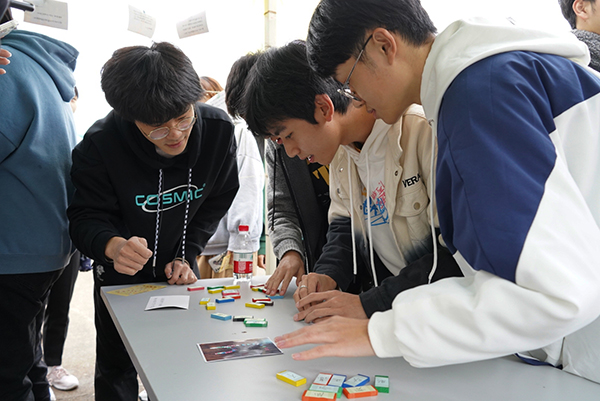 每个展区都有独属的特色。数学与计算机科学学院策划的“数海寻谜”中,参赛者们遨游在数字海洋,争分夺秒进行头脑风暴;马克思主义学院的“重走长征运粮路”则将红色长征和趣味游戏巧妙结合,不仅考察了参与者的党史知识,还通过蒙眼运粮的形式去身体力行地感受长征的艰难困苦;在文化创意与传播学院的“放心,我在”中,一人取水,三人协助扶持,充分展现了寝室之间相互合作扶持的团结精神。