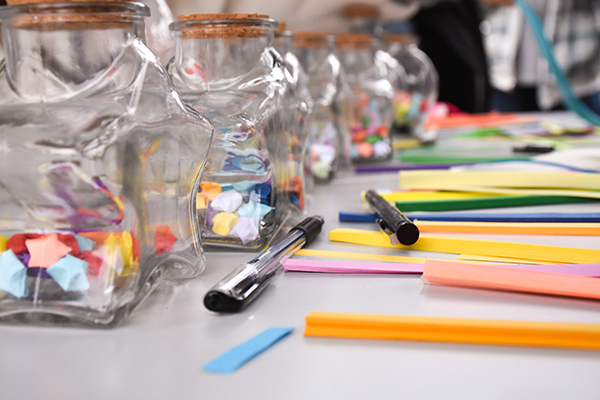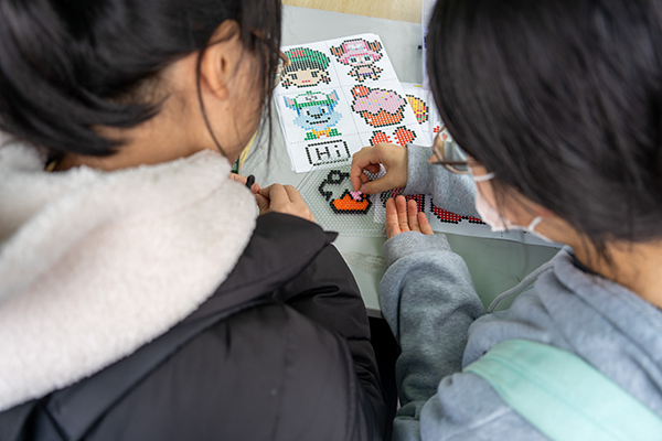 “已经排到56号了”,“点豆豆,拼未来”场地的工作人员兴奋又怀带歉意地对排队的同学们说道,足见活动的火热程度。同学们可根据自己喜欢的图案进行制作,仔细挑选对应颜色的小珠子,再小心翼翼地将珠子戳进模具里,一幅幅可爱的兔子、小熊就在手下诞生了,既童真又简单。