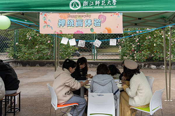 全场热闹非凡,人潮涌动,有一处展位却格外安静——展棚下的同学们高度专注地在一张方方正正的纸片上用黑笔描绘着,或是画出一条条变幻着的黑线,或是转动手腕绕出一个圆,简单的点线构成了一副不简单的画作。这就是浙师心理辅导站的传统项目——“禅绕画”,意求让学生们在创作的过程中接纳自己,释放压力。