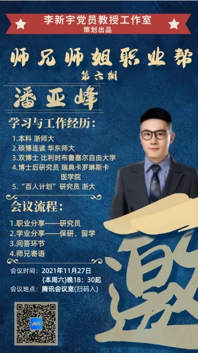 为帮助更多同学进行学习和未来求职,2021年11月27日晚,由李新宇党员教授工作室策划出品的师兄师姐“职业帮”第六期于线上举行,本次分享会请到了浙江大学“百人计划”特聘研究员,我校14届应用心理学专业毕业生——潘亚峰校友。
