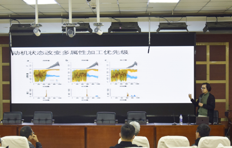 沈波博士学术汇报的题目是“内疚情绪与社会行为交互的动态过程”,主要通过两个相关课题进行介绍。课题一基于内疚所诱发行为动机的复杂性,探究内疚者在既想要弥补受害者,又担心与受害者面对面接触时,其内心经历了怎样的冲突过程。课题二基于以往研究对道德规范的形成与发展的关注,探究在个体对新的道德规范进行学习的动态过程中,内疚如何参与其中并体现其亲社会的促进作用。两项研究使用新技术与新范式,发现内疚情绪在改善人际关系,促进道德规范学习中发挥重要作用。