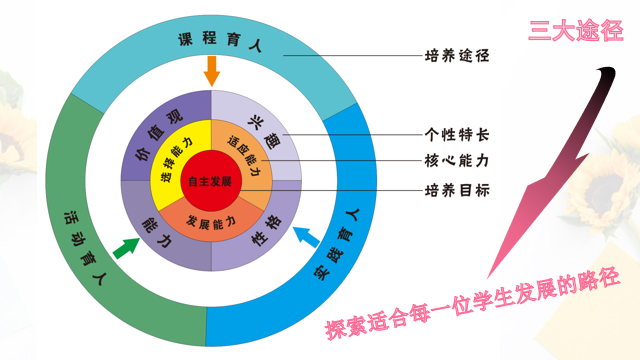 目前温岭中学已经形成了比较系统的校本生涯教育实施体系,学校主要通过课程育人、活动育人、实践育人三个途径,“探索适合每一位学生发展的路径”,培养学生的自主发展能力。