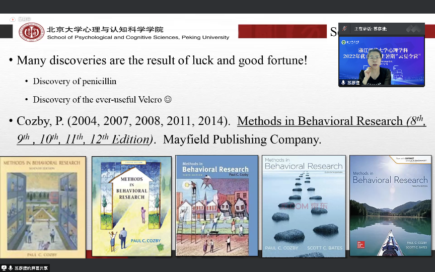 此外,为了研判营员们的专业能力水平,夏令营安排营员们参与了线上心理学核心能力测验,高崚峰博士根据测试情况对营员们在实验设计、实验变量操纵、及统计分析方法等方面进行了针对性指导。与此同时,夏令营还推出“小组导师制”,设置了分组研讨与研究设计环节,营员们在指导老师带领下进行了深入的分享与交流,导师对同学们的疑问进行了详细的解答。学科也专门安排了心理学科在读研究生为营员们分享经验,并邀请优秀营员代表张心茹、郑珺等交流学习体会。