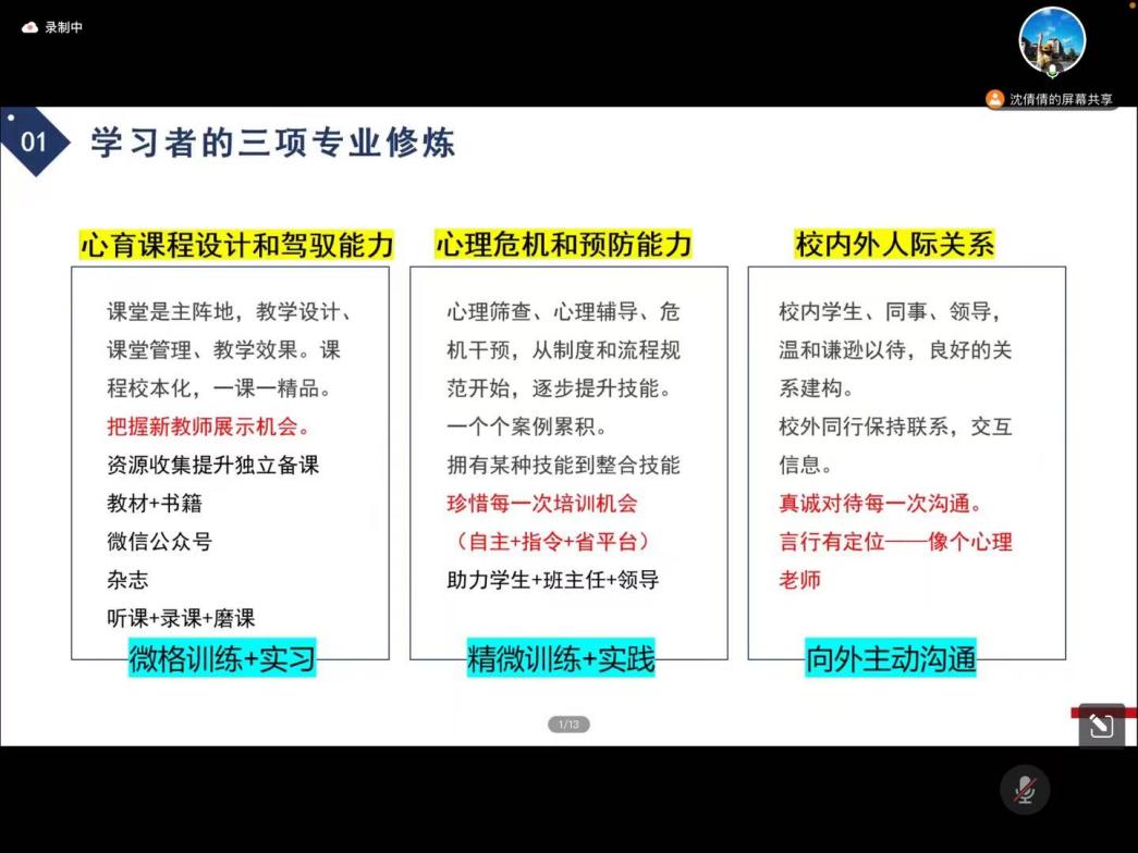 沈倩倩老师首先向我们介绍了她的工作经历,讲述了目前心理老师这个岗位的前景以及存在的问题。同时,她将自己九年的工作经历分为学习者、参赛者、领队者、招聘官四个阶段。对于“学习者”阶段,她提出了“有为才能有位”,也向我们展示了“学习者”的三项专业修炼:心理课程设计和驾驭能力、心理危机和预防能力以及校内外的人际关系;在“参赛者”阶段,沈倩倩老师提出了“打造个人品牌”,以自己亲身经历,分享在竞赛中取得优胜的“秘诀”;在“领队者”阶段,沈倩倩老师提出“专业服务需要”,她认为专业队伍发展是服务学科发展需要的;在“招聘官”阶段,她提出“合适才是最好”。沈倩倩老师从自身经历出发,对心理老师这一岗位进行了详细的讲述,让作为学生的我们在就业方面,有了一个更明确的方向。