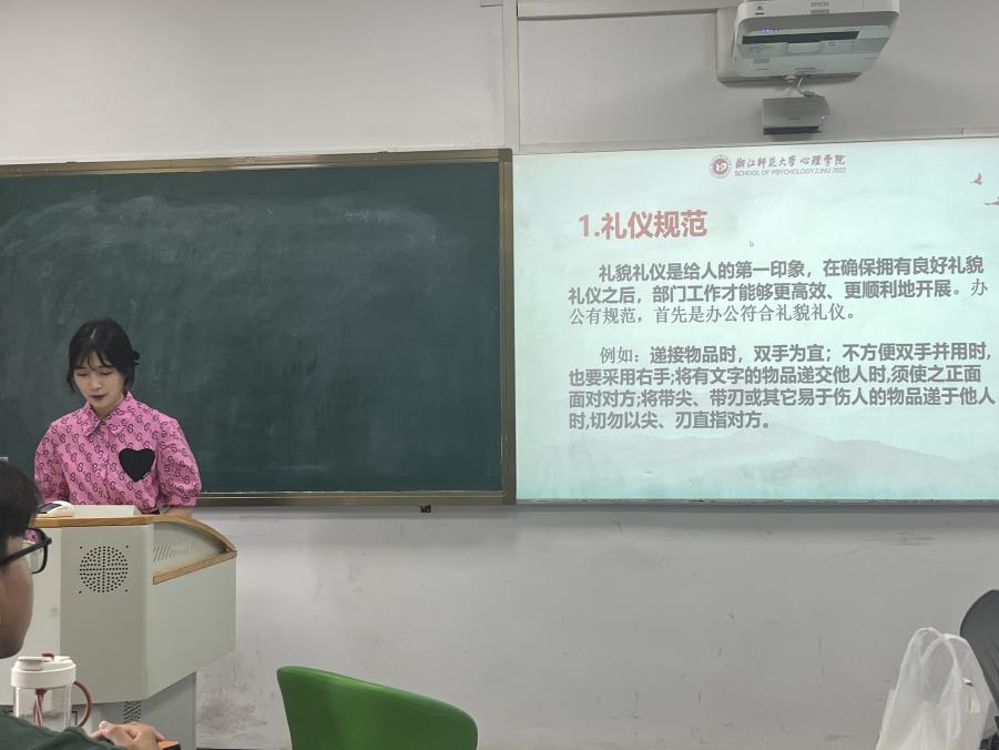会议第二部分,汪朵颐以“办公规范”为主题,分为“礼仪规范”“会务规范”“文件规范”三块内容,向在座各部门的同学们详尽地介绍了各个方面的礼貌礼仪注意事项。礼貌礼仪是给人的第一印象,规范化的文件更有利于各部门信息的收集,这些日常办公的细节,无形中也会提高干部干事们的工作效率。