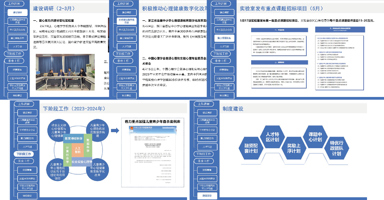 一、“工作进展”方面。实验室在李伟健、孙炳海、和汪俊等带领下凝聚全院师生,通过邀请省团委领导、西安电子科技大学大学实验室专家来实验室指导建设,同时主动参观其他省部级科研平台汲取建设经验;通过举办浙江省首届中小学心理健康数字化改革高峰论坛、普通心理与实验心理专委会、教育心理专委会、“智能时代的德育”学术研讨会等高水平学术会议,推动儿童青少年心理健康数字化改革建设工作;率先发布省哲社实验室重点课题项目,以课题为纽带汇聚人才;此外,制定 “英才特岗”计划,筑巢引凤。二、“下阶段工作”方面。实验室将采用行为认知科学、人工智能、计算社会学、社会心理学和教育神经科学五大方法学体系,紧紧围绕“社会主义核心价值观”、“儿童青少年心理危机状况数据库构建”、“儿童青少年心理危机识别与干预理论与应用研究”和“儿童青少年心理健康数字化改革”四个重点课题加强建设。为助力我省乃至全国青少年健康成长,实验室将重点加强儿童青少年**案例库建设。此外,实验室将制定“融资配套计划”、“人才特区计划”、“奖励上浮计划”、“课题中心计划”和“特优行政团队计划”为实验室高质量发展提供政策支持。三、“未来工作”方面。实验室将逐步建成占地2000平方米、拥有“行为认知-神经生理-社会计算-人工智能”高水平技术支撑的四维一体科研平台,努力打造浙江省哲学社会科学样板实验室。