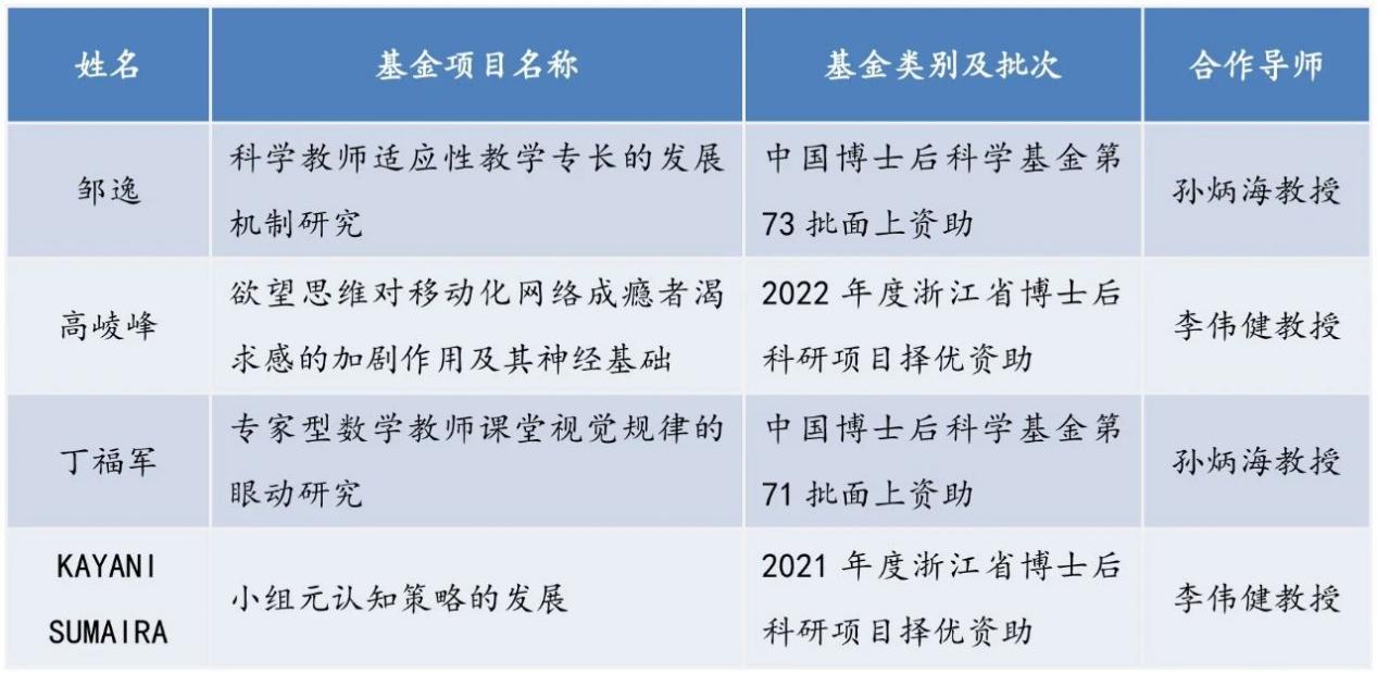 2023年6月21日,中国博士后科学基金会发布“中国博士后科学基金第73批面上资助人员公示名单”。心理学博士后科研流动站邹逸获得面上资助,项目名称为“科学教师适应性教学专长的发展机制研究”,合作导师为孙炳海教授。