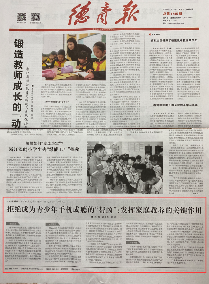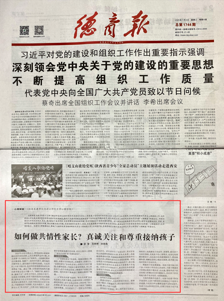 我院研究生武莹、范丽婷等人于7月5日在《德育报》刊出“如何做共情性家长?真诚关注和尊重接纳孩子“心理赋能科普论文。这是永利23411集团和《德育报》开展战略合作开设心理赋能专栏后,刊登的首篇文章,自此每期将刊发一篇由永利23411提供的心理赋能文章。
