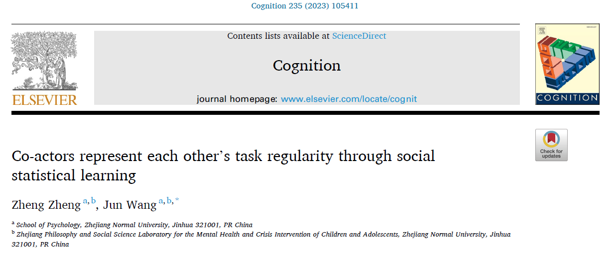 论文来源:Zheng, Z., & Wang, J.* (2023). Co-actors represent each other's task regularity through social statistical learning. Cognition, 235.