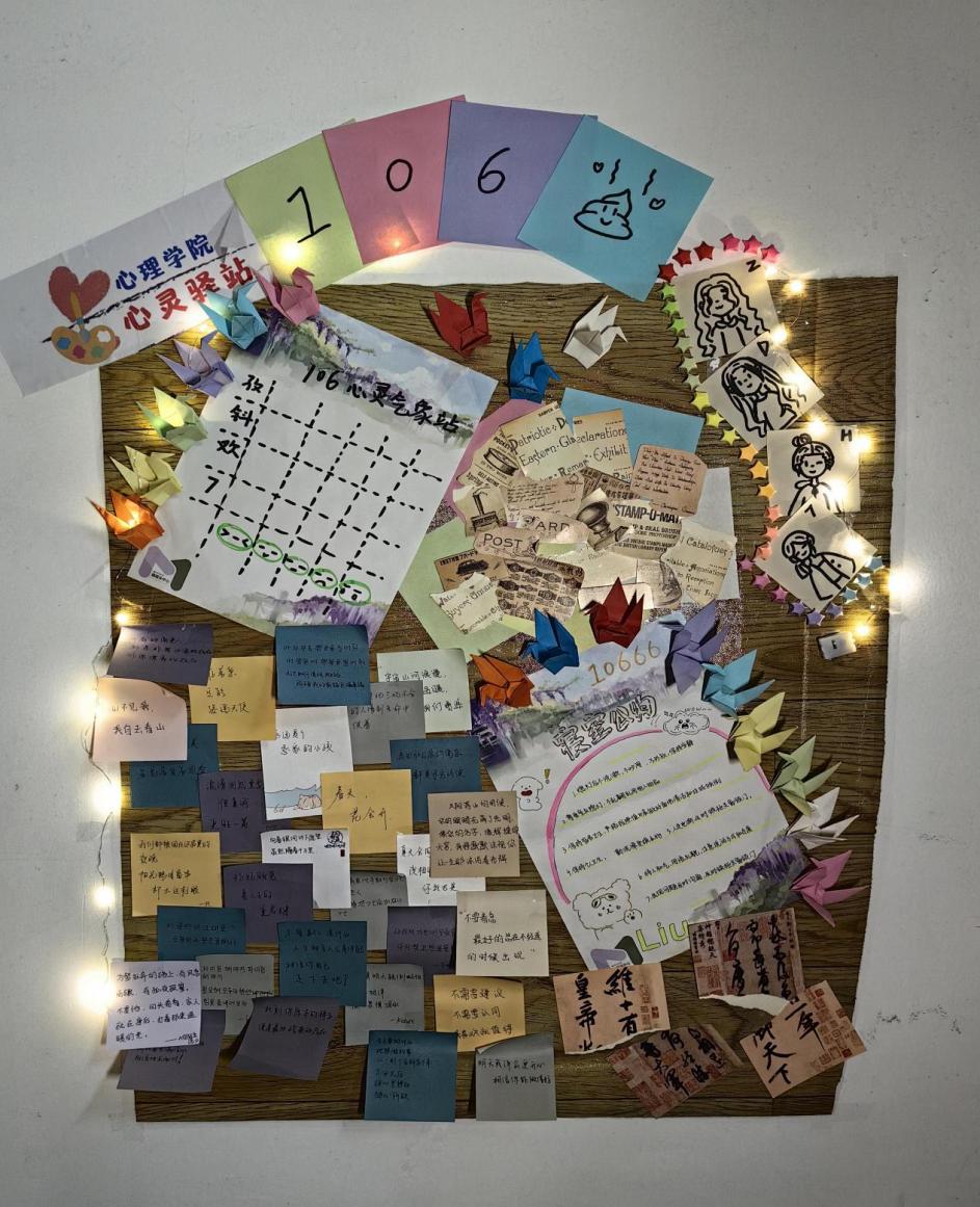 “106,666!”桃源6-106寝室的心灵驿站主要分为四个部分:心情气象站、寝室公约、艺术角以及便签随笔区。由千纸鹤包围着的是由大家共同制定共同遵守的寝室公约。左下角是便签随笔区,上面有大家喜欢的语录、心灵鸡汤以及一天当中有趣的事或是一些小牢骚。最后一块文艺角暂时由明信片组成,在之后的共同生活里,她们将会用合照或是自己拍的风景慢慢填满每一个空白,让106变成真正的“温馨小家”!