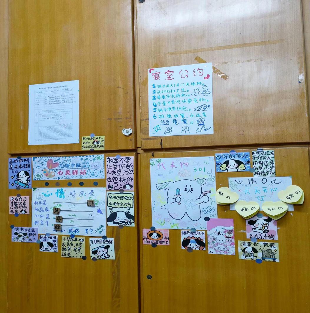 桃源6-301寝室的代表物是一只拿剑拿枪的英勇小狗,并且她们的心灵驿站由不同样子的元气小狗组成,每个人都有自己的专属代表物,每晚回寝后,大家都会在自己的心情记录上用移动小机关的方式总结今天的心情状态。