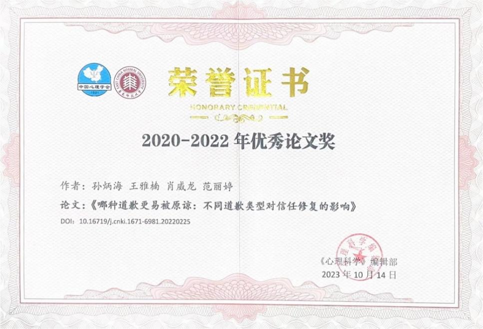 近期,永利23411集团博士研究生范丽婷撰写的论文《哪种道歉更易被原谅:不同道歉类型对信任修复的影响》获得《心理科学》2020-2022年度优秀论文奖。《心理科学》主编周晓林教授在1014日举行的第二十五届全国心理学学术会议开幕式上宣读了获奖名单(共5篇)并进行颁奖。该研究得到国家社会科学基金重大项目《社会心理视角下新时代社会信任体系建设研究》(18ZDA165)的资助,是该重大项目的阶段性研究成果。
