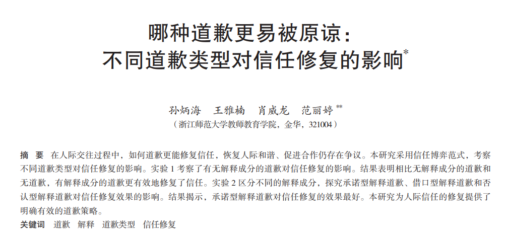 论文来源:孙炳海,王雅楠,肖威龙,范丽婷. (2022). 哪种道歉更易被原谅:不同道歉类型对信任修复的影响. 心理科学, 45(02), 454-461.