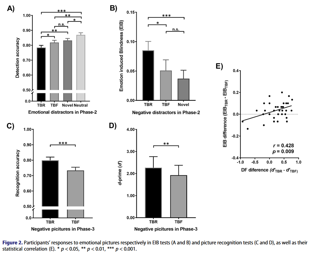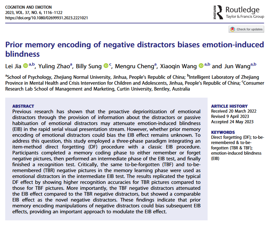 论文来源Jia. L., Zhao Y., Sung, B., Cheng, M., Wang, X., & Wang, J. (2023) Prior memory encoding of negative distractors biases emotion-induced blindness. Cognition and Emotion, 37(6), 1116-1122.