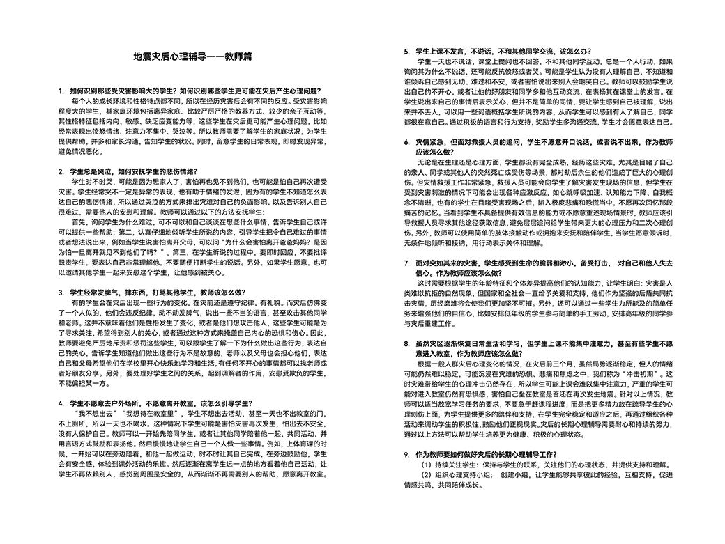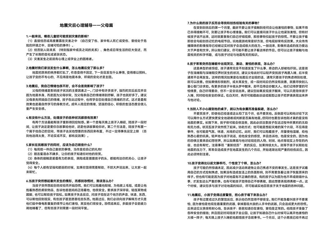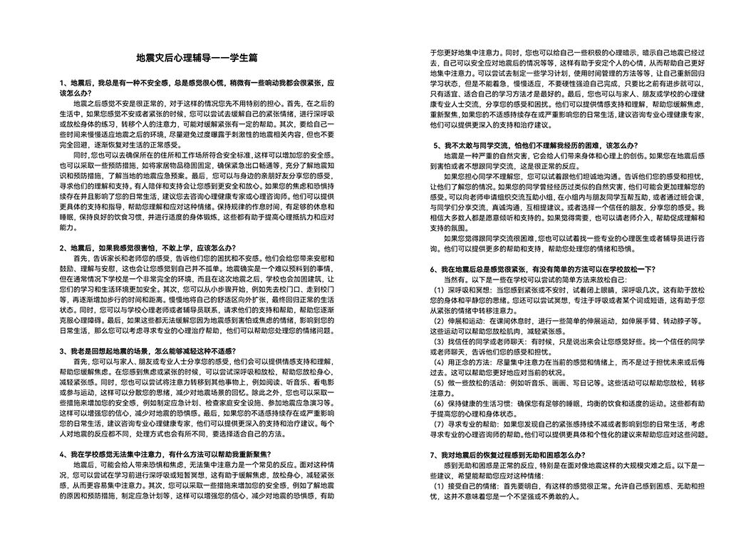 交流期间,戴大为告诉我们甘肃田家炳中学受到地震影响,师生们遇到很多困难,希望开展及时的心理援助。带队老师孙炳海、詹沛达和孙琪当场决定,将指导访问团的二十位学生迅速开发灾后心理危机干预手册,尽快通过田家炳基金会提供给灾区师生。在返程的火车上,同学们在老师的指导下,一边查询资料,一边撰写手册,争取尽快完成。