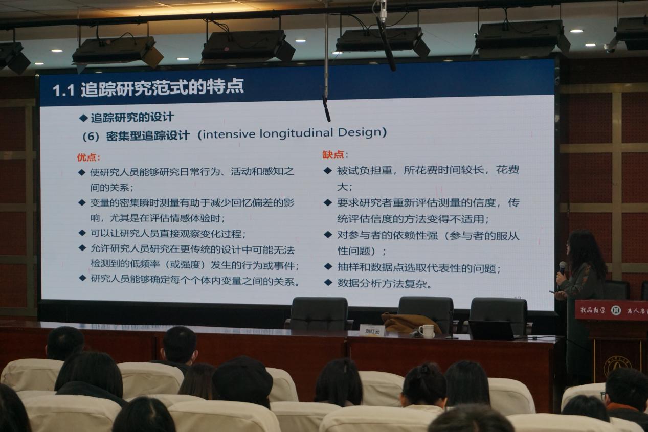 刘红云教授系统地介绍了追踪研究范式的特点及其进展。讲座伊始,刘红云教授首先对同时性横断设计、重复测量的追踪研究等常见的追踪研究设计及其优缺点进行了简要的介绍。随后,刘红云教授进一步向在场师生介绍了技术发展所带来的新的数据收集方式:密集型追踪设计。此外,刘红云教授分享了当前追踪研究的最新进展,并简要介绍了追踪面板设计和密集型追踪设计这两类基本追踪设计的数据分析方法。