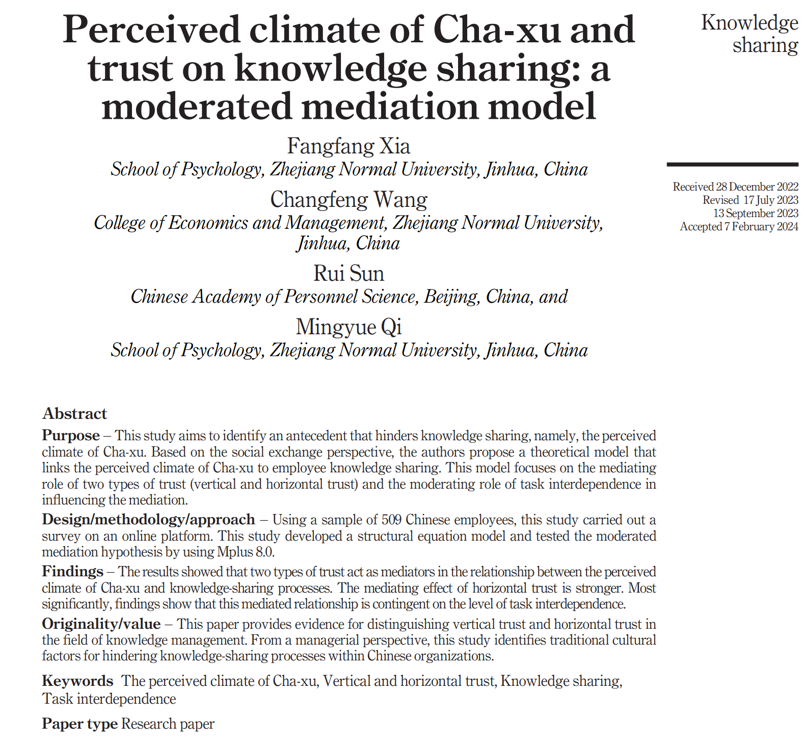 近期,我院2020级硕士研究生夏芳芳和王长峰教授课题组在Nankai Business Review International(IF=2.8)发表了题为Perceived Climate of Cha-xu and Trust on Knowledge Sharing: A Moderated Mediation Model的学术论文。研究基于社会交换视角,探讨了团队人际信任和任务相依性在员工差序氛围感知与知识共享之间的作用。我院2020级硕士研究生夏芳芳为论文第一作者,王长峰教授为通讯作者;另外,中国人事科学研究院孙锐研究员和我院2022级硕士研究生齐明月为该研究合作者。该研究得到了国家社科基金重点项目(22AGL006)和重大项目(22ZDA037)的支持。论文来源:Xia, F., Wang, C., Sun, R. and Qi, M. (2024), Perceived climate of Cha-xu and trust on knowledge sharing: a moderated mediation model. Nankai Business Review International. 文章链接:https://doi.org/10.1108/NBRI-12-2022-0116.