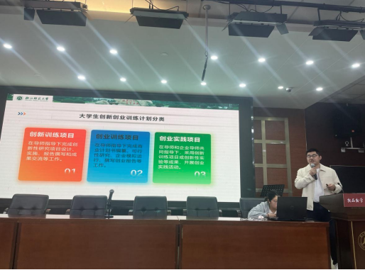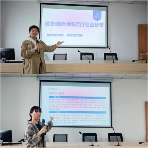 宣讲会同时邀请了学院省级创新项目负责人2021级本科生余凯欣和省级创业项目负责人2022级本科生王刺红,以自己负责的项目为例,详细介绍了双创项目的选题过程、申报填写、团队分工、项目特色和结题准备,使同学们对项目申报和开展有了更直观的感受和了解,展示了榜样作用。