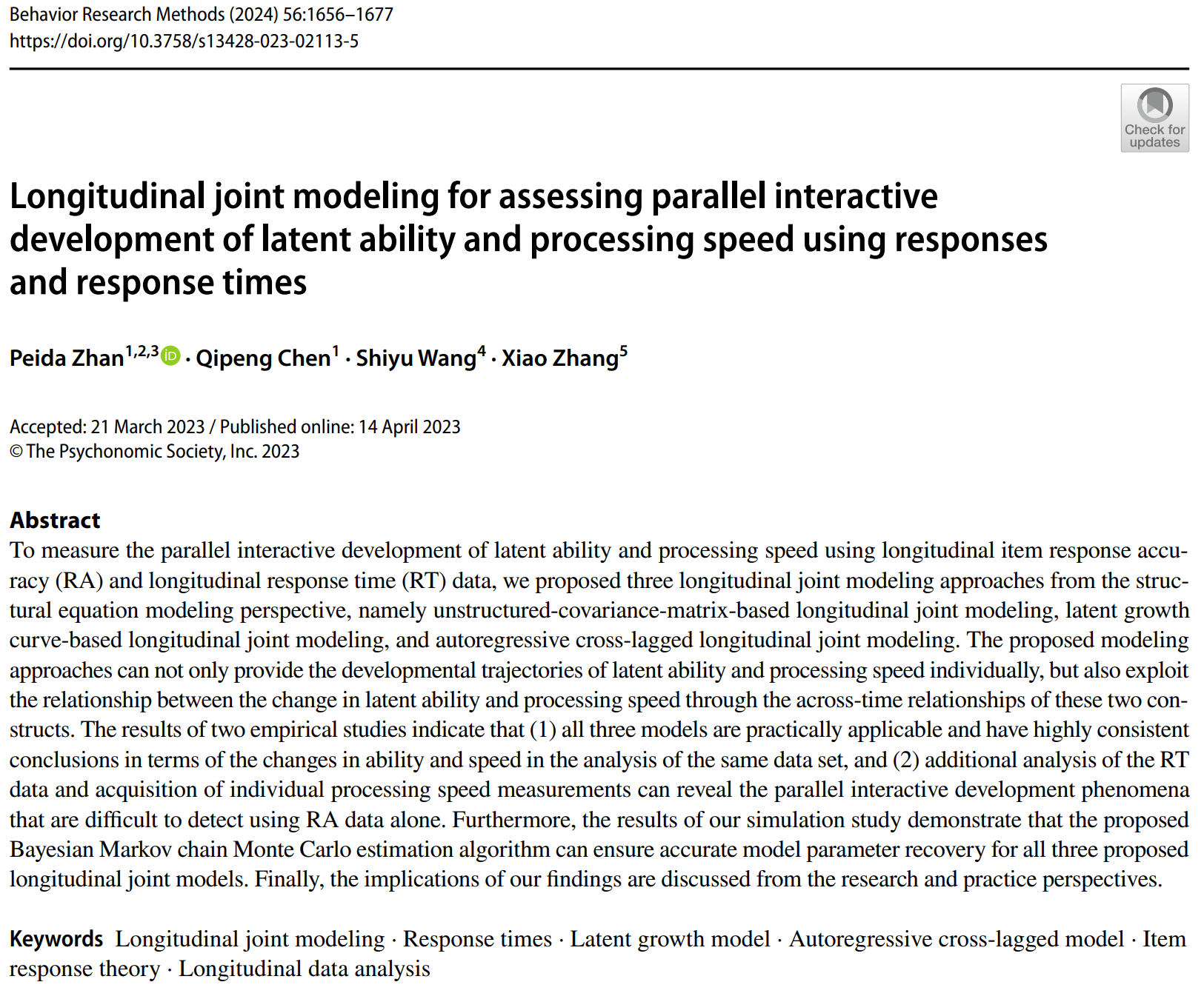 论文来源:Zhan, P., Chen, Q., Wang, S., & Zhang, X. (2024). Longitudinal joint modeling for assessing parallel interactive development of latent ability and processing speed using responses and response times. Behavior Research Methods, 56, 1656-1677.