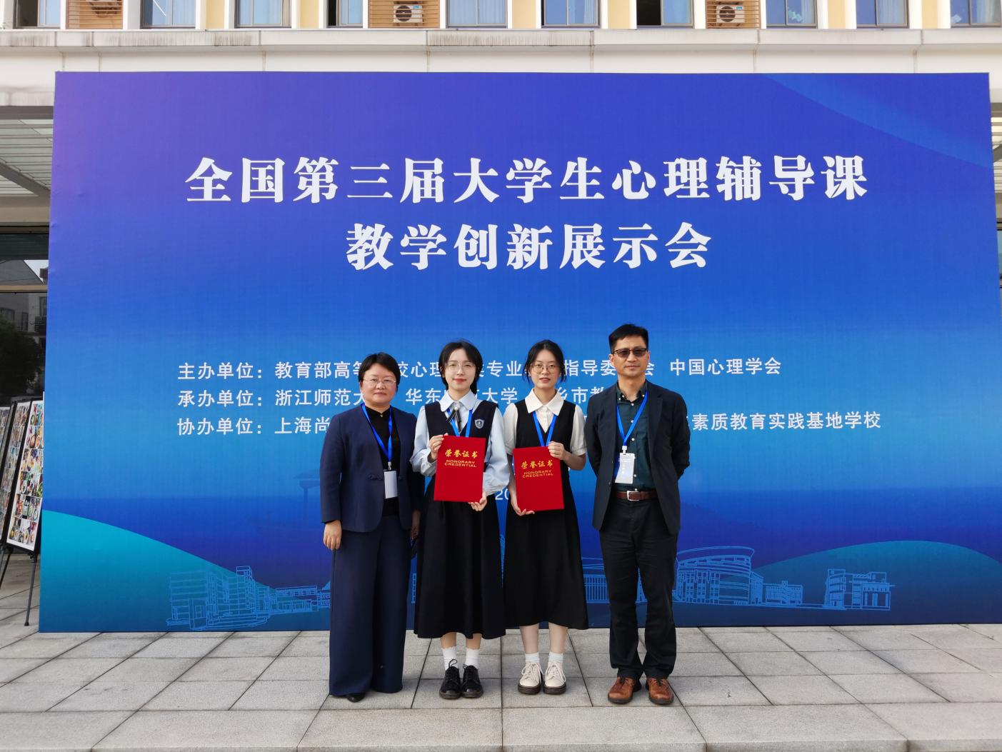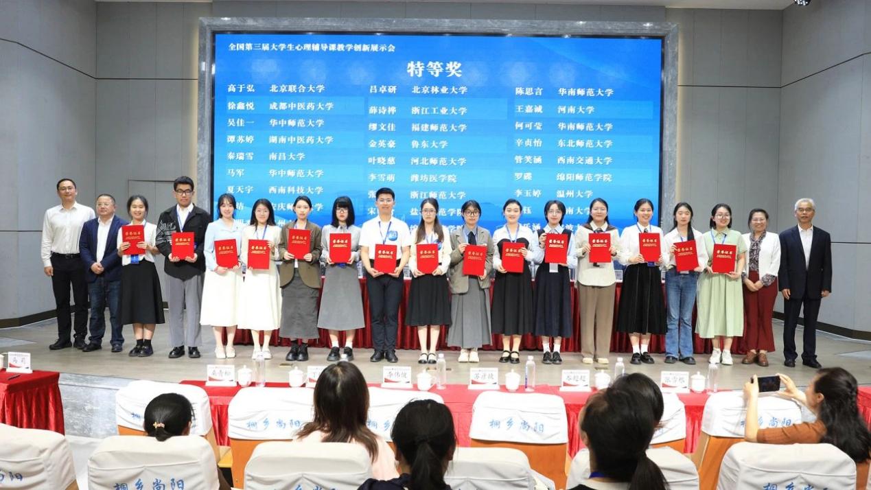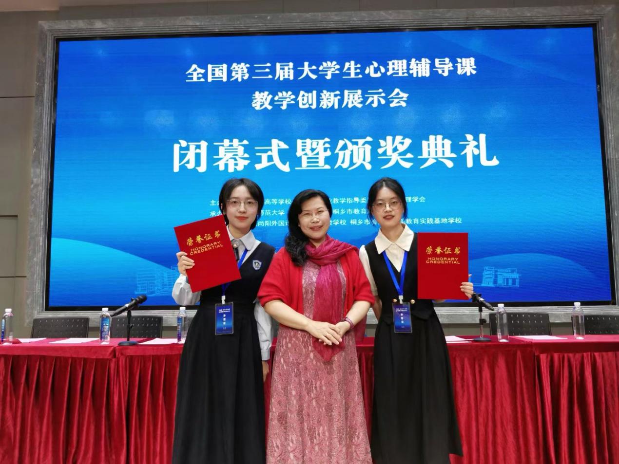 2024年4月25—26日,全国第三届大学生心理辅导课教学创新展示会在浙江桐乡举办。展示会由教育部高等学校心理学类专业教学指导委员会主办,浙江师范大学、华东师范大学、桐乡市教育局承办,上海尚阳外国语学校桐乡实验学校、桐乡市青少年素质教育实践基地学校协办。经过激烈角逐,我院应用心理学211班张银秋同学、212班章倩同学分别获得特等奖和一等奖的好成绩。