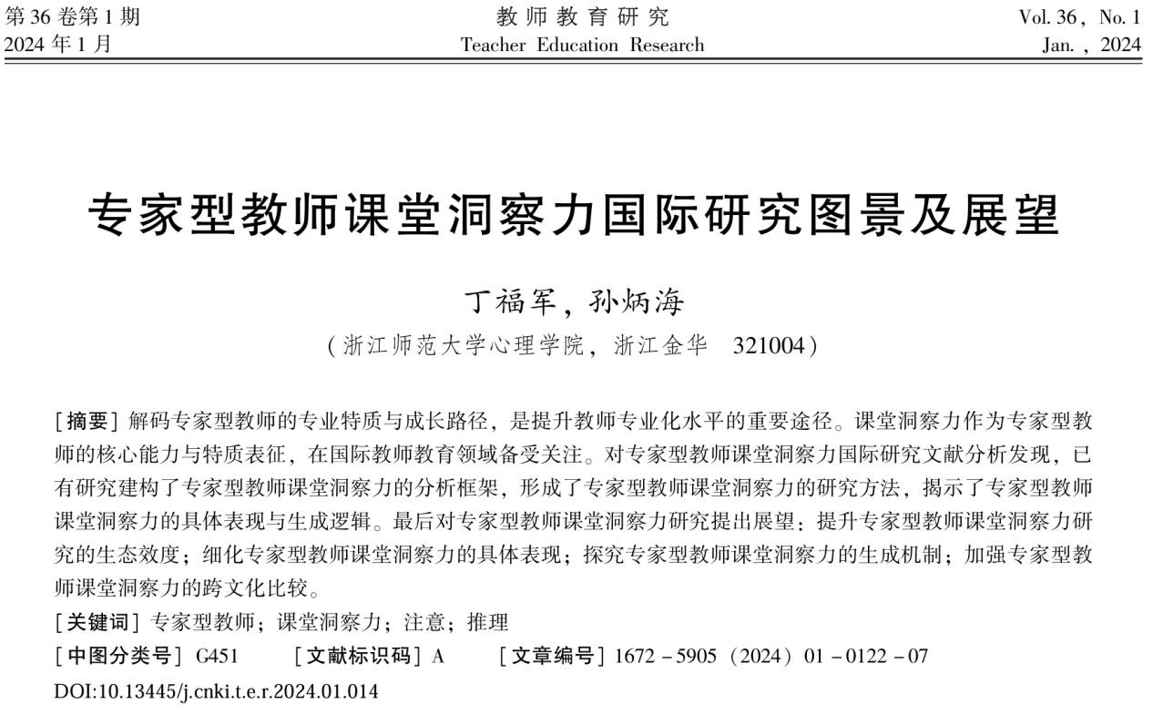 近期,永利23411集团丁福军博士和孙炳海教授在《教师教育研究》(CSSCI)发表了题为《专家型教师课堂洞察力国际研究图景及展望》的学术论文,探讨专家型教师课堂洞察力国际研究的最新动向与趋势。丁福军博士为本文第一作者,孙炳海教授为通讯作者。我院拥有国内首个教师教育神经科学交叉学科博士点,十分重视教师教育神经科学的研究,这是我院教师教育神经科学研究团队,采用认知神经科学的方法解码专家型教师成长规律的系列研究成果之一。论文来源:丁福军, 孙炳海. (2024). 专家型教师课堂洞察力国际研究图景及展望. 教师教育研究, 36(01):122-128.文章链接:https://doi.org/10.13445/j.cnki.t.e.r.2024.01.014