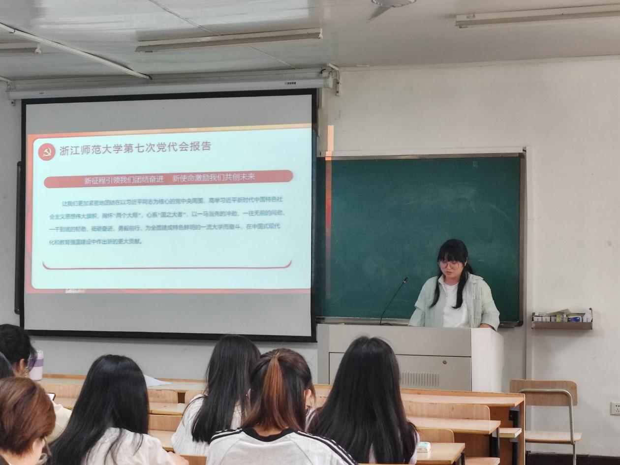 唐心怡同学以浙江师范大学第七次党代会精神为题,从浙师新成就、浙师新愿景、浙师新篇章、浙师新局面四方面展开汇报分享,并表示新征程引领我们团结奋进,新使命激励我们共创未来。