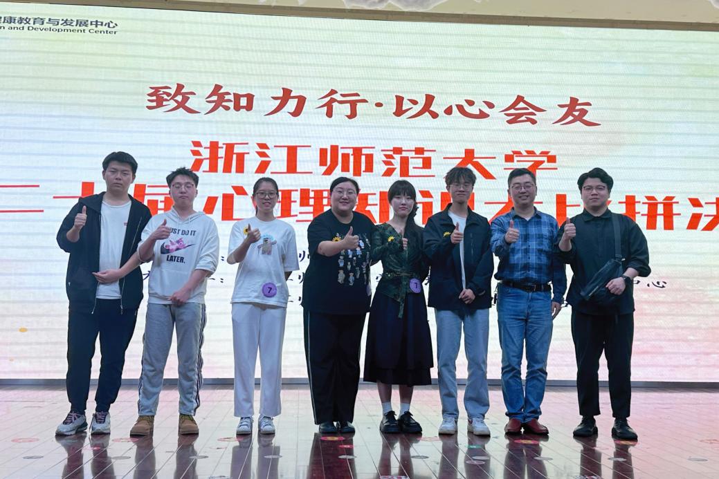 2024年5月12日晚,浙江师范大学“致知力行·以心会友”第二十届心理知识大比拼决赛在大学生活动中心二楼报告厅顺利举行。在院赛、校晋级赛的前期选拔后,我院“嘎嘎棒”队伍成功入围校赛。