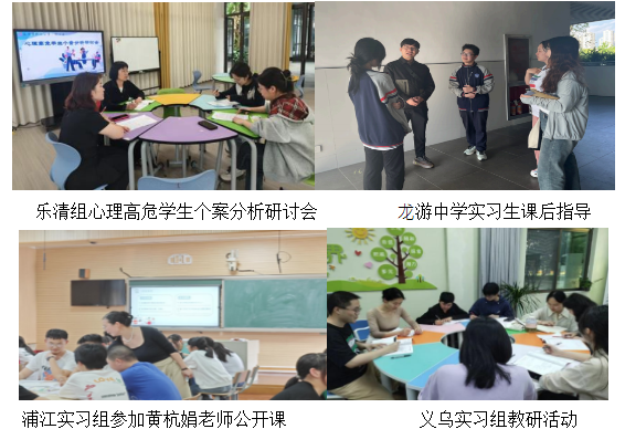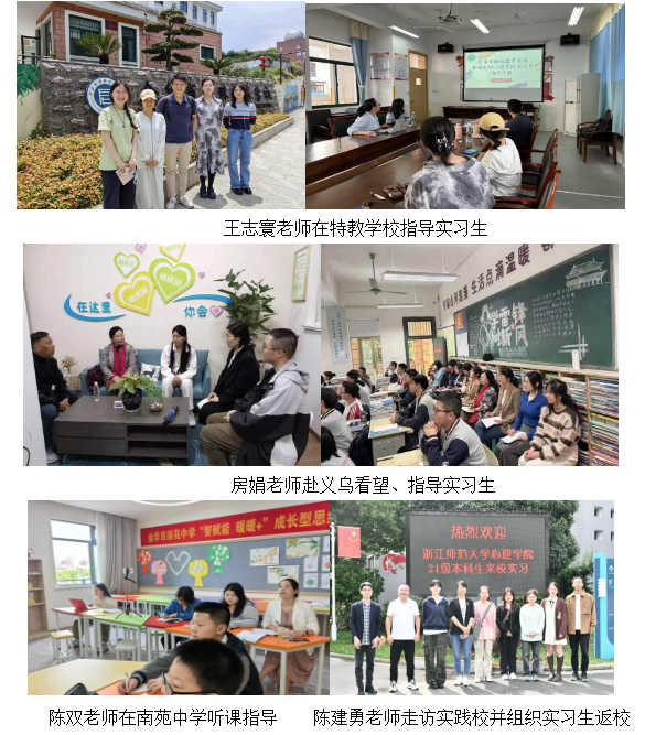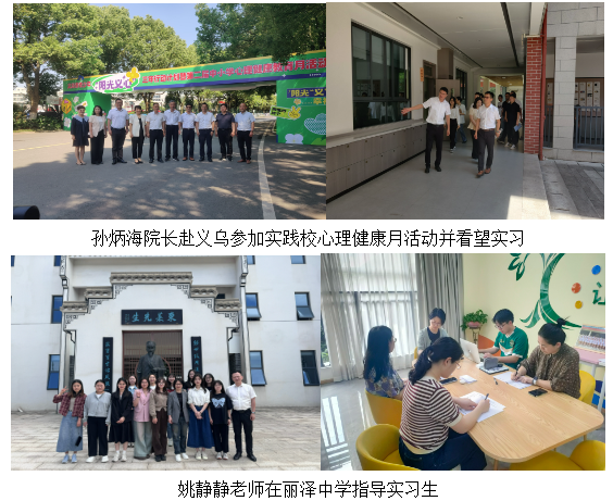 学院高度重视学生实习工作及成效,院长孙炳海、实习指导教师房娟、王志寰、姚静静、陈双等,分赴义乌、乐清、金华等实践校,了解实习期间教育教学、班级管理、教研活动开展情况,倾听和收集实践校对学院人才培养的建议和需求。学院领导和老师希望实习生们努力提升教学水平和综合素质,成为优秀的心理学人才。