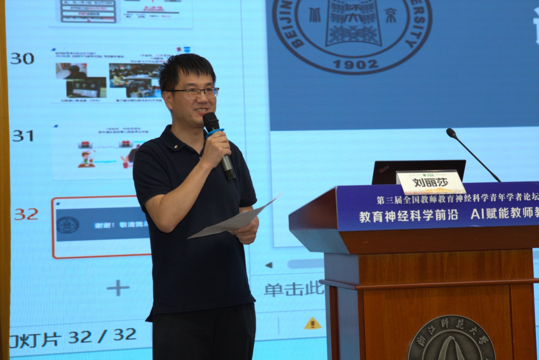 浙江师范大学孙炳海教授汇报了真实课堂互动情境中专家和新手教师在教学互动中教学行为与神经同步差异的最新发现。