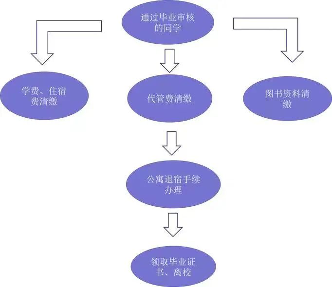 上缴学生证加盖留念章——确认离校系统流程办结——领取毕业证书、学位证书——核对双证编号无误签名——第一批教师资格证认定通过领取教师资格证书;参加校考合格的同学领取教师职业能力证书——核对无误签名。