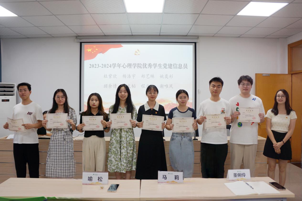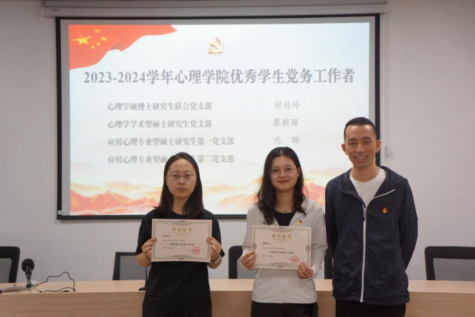 马莉书记、喻松老师和董俐伶老师分别为2023-2024学年优秀学生党员、优秀学生党务工作者和优秀学生党建信息员颁发荣誉证书。