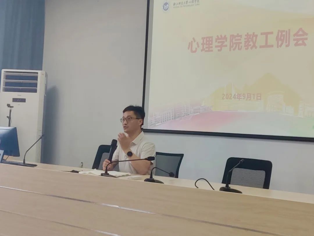 院长孙炳海回顾了暑假以来学院各项工作的开展情况,重点传达了学院暑期人才工作会议精神。他指出,我们要围绕“一切为了学生”的宗旨,要与时俱进切实提高心理学应用型人才核心竞争力:一是心理咨询和心理辅导能力,二是心理测评和数智监测能力,三是活动和教学课程研发能力,四是心理预防和智慧干预能力,五是顶层设计和策划组织能力,六是实验设计和科学研究能力,七是主动承担社会责任的能力,八是学会自主成长的能力,九是融入学校教育的能力。会议最后,新入职教师贾熙泽、彭思韦做了自我介绍。