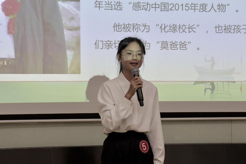 5号选手蓝丽婷为现场观众带来了题为《激扬教育星火,赓续可爱中国》的精彩演讲。她用激昂的语气,给我们讲述了一位伟大的校长莫振高的故事。“万千星火中您熠熠生辉”绘就了她心中的可爱中国,也激励着她向教师梦努力前进。