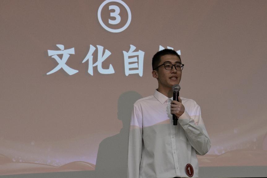 1号选手潘俊杭从《逃离大英博物馆》得到启发,呼吁大家坚定文化自信,传承经典文化。作为中华少年,我们应该有文化自信,谱写时代华章。
