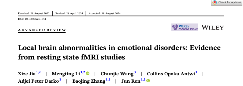 近期,永利23411集团任俊教授和贾熙泽教授分别在Wiley Interdisciplinary Reviews-Cognitive Science(中科院二区)和Journal of Neuroscience Research(中科院三区)期刊发表了题为Local brain abnormalities in emotional disorders: Evidence from resting state fMRI studies和Frequency- Specific Alternations in the Amplitude of Fluctuations in Tension- Type Headache: A Machine Learning Study的学术论文。贾熙泽为论文的第一作者,任俊教授为通讯作者,两项研究均得到了国家青年自然科学基金(82001898)的资助。论文来源:Jia, X., Li, M., Wang, C., Antwi, C. O., Darko, A. P., Zhang, B., & Ren, J. (2024). Local brain abnormalities in emotional disorders: Evidence from resting state fMRI studies. WIREs Cognitive Science, 15(6), e1694. https://doi.org/10.1002/wcs.1694Jia, X., Li, M., Zhang, S., Antwi, C. O., Zhan, L., Zhao, M., Wen, J., Hu, S., Hao, Z., & Ren, J. (2024). Frequency-Specific Alternations in the Amplitude of Fluctuations in Tension-Type Headache: A Machine Learning Study. Journal of Neuroscience Research, 102(11), e25398. https://doi.org/10.1002/jnr.25398