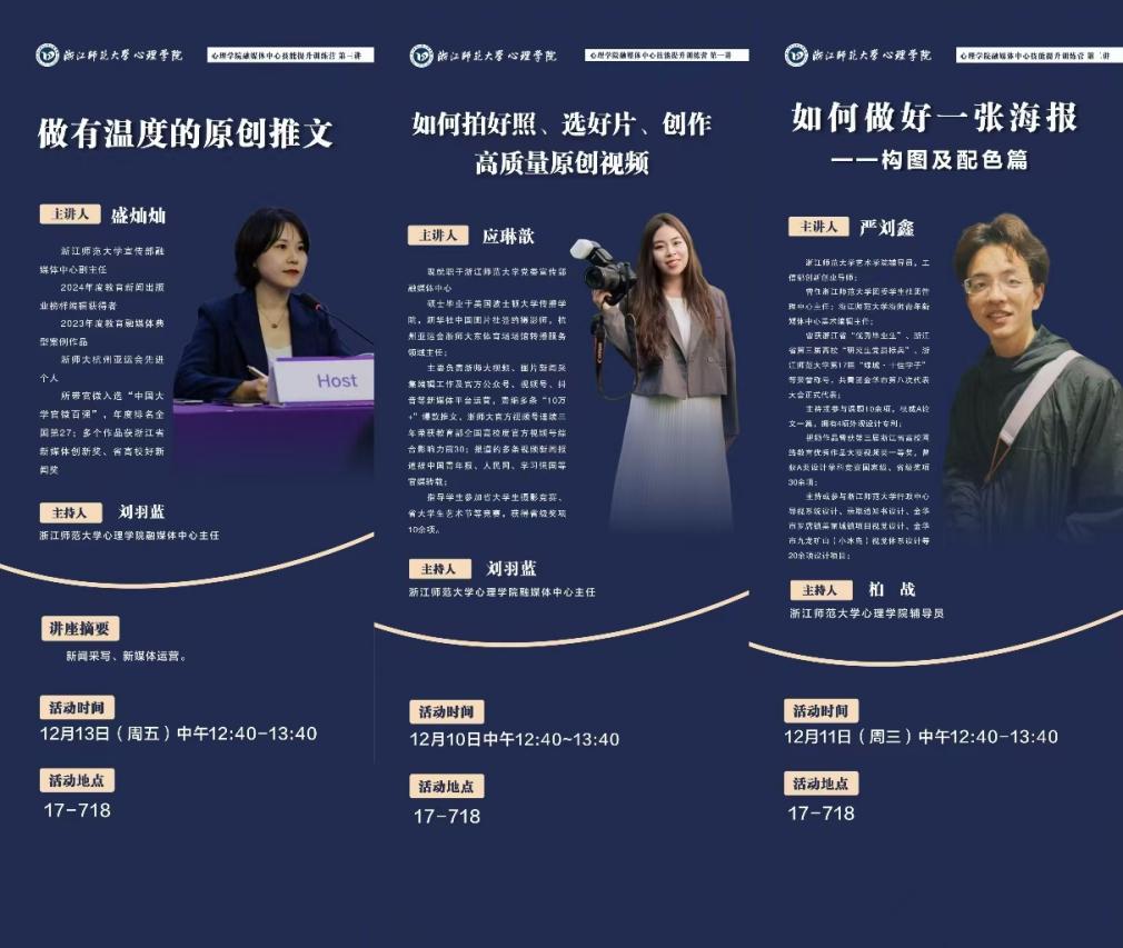 为进一步提升融媒体中心同学们的业务能力和综合素质,推动学院融媒体工作不断创新发展。12月10日至13日,永利23411融媒体培训交流会于17幢718顺利举行。本次培训交流会邀请到校党委宣传部融媒体中心副主任盛灿灿、校党委宣传部融媒体中心应琳歆和艺术学院辅导员严刘鑫分别就新闻采编、摄影选片和海报设计开展分享。院融媒体中心全体成员参与了本系列培训。