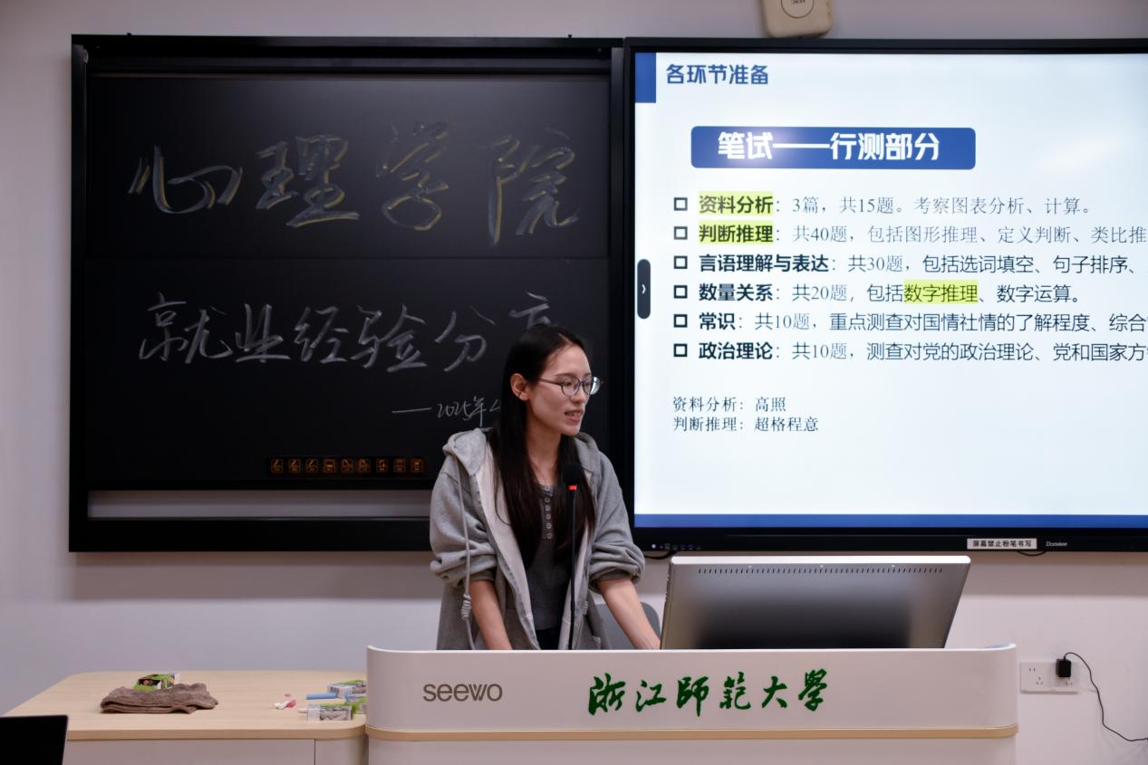 黄银同学以优异成绩成功考取浙江省公务员,她首先系统梳理了公务员考试的主要类型,包括省考、国考和选调生考试,并重点围绕浙江省考的考试规则、报考条件等进行了详细解读。在备考经验分享环节,她结合自身经历,从笔试复习策略、面试技巧等方面进行了全面讲解,特别总结了复习过程中的重难点和常见题型,为同学们提供了切实可行的备考建议。
