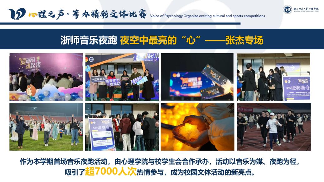 文体活动创新不断,既有“心设计·创未来”心理班会设计大赛等专业特色活动,又有全院参与的师生四季运动会。其中,与校学生会联办的音乐夜跑活动吸引7000余人参与,打造“心理+体育”的校园文化新模式。