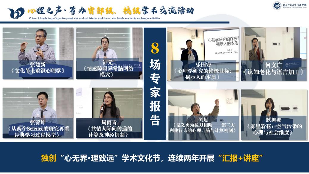 研会充分发挥专业特色,为研究生们搭建了多层次、立体化的学术交流平台。其中,“心无界·理致远”学术文化节汇聚专家报告与学术汇报,线上线下辐射;134期“尖峰卓越心理讲堂”为研究生科研能力提升提供了有力帮助。