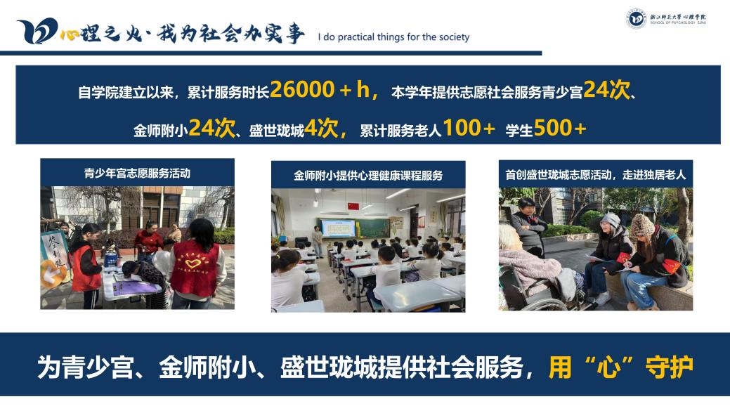 学生会立足专业特色,打造全方位成长支持体系:开设心理统计、测量等专业课程帮扶项目,解决学业难题;在志愿服务方面,持续开展青少年宫等传统项目,累计服务时长超2.6万小时;推出盛世珑城空巢老人帮扶计划,彰显新时代青年的责任担当。