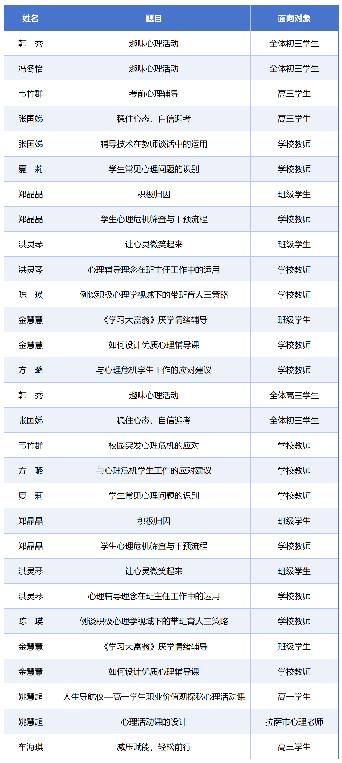 在支教活动共计开展面向学生的心理课程13堂,面向班主任学科教师心理讲座13场次,落地名师网络工作室2个。这场横跨经纬的"教育共富"实践之旅,让江南心育智慧在雪域大漠生根抽芽,以专业之力铺就新时代"润心之路",诠释着师者无疆的精神海拔。