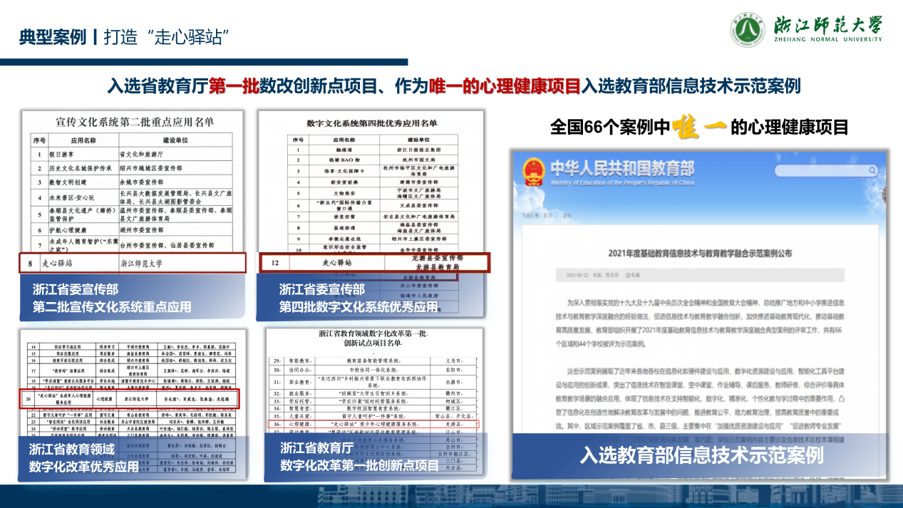 在数字赋能方面,指导地方研发“走心驿站”“心路e通”等心理服务应用,构建覆盖全省的智能化心理服务网络。其中,“走心驿站”作为国内首个基于“风险累积—正向支持”模型的智能识别系统,实现心理危机无感化筛查与分级干预,并接入“浙里办”服务全省。该系统获时任省委主要领导两次肯定性批示,被评为“可推广到各地的好做法、好经验”,并作为教育部唯一心理健康类信息技术示范案例在全国推广。